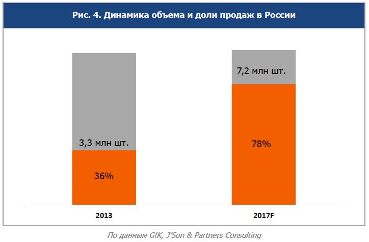 В 2017 году будет продано 7,2 млн Smart TV, что составит 78% продаж всех плоскопанельных телевизоров. Для сравнения, в 2013 году (по данным GfK Rus) было продано 3,3 млн Smart TV, что составило 36% продаж всех плоскопанельных телевизоров.