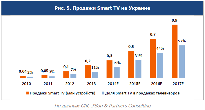 В 2013 году, по данным GfK Ukraine, на Украине было продано 220 тыс. Smart TV телевизоров, доля в продажах ТВ составила 11%. К 2017 году, по прогнозам J’son & Partners Consulting, продажи вырастут до 930 тыс. устройств Smart TV, что составит 57% среди всех проданных ТВ.