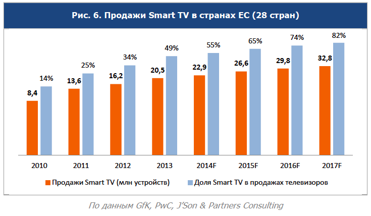 В целом, в ЕС в 2013 г. было продано 20,5 млн Smart TV, их доля в продажах достигла 48,6%. К 2017 г., по прогнозам J’son & Partners Consulting, ожидается рост продаж до 32,8 млн Smart TV, что составит 82% всех продаваемых телевизоров.