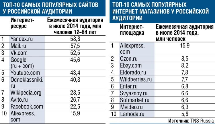 В десятку сайтов, самых популярных у российских пользователей, в июле впервые попал интернет-магазин: это входящий в китайскую группу Alibaba сервис Aliexpress.com, чья ежемесячная аудитория, по данным TNS Russia, уже достигает почти 16 млн россиян