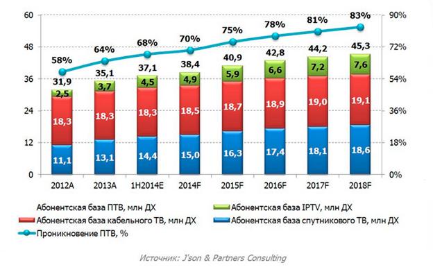 Согласно прогнозам J’son & Partners Consulting, рост абонентской базы платного телевидения в России продолжится, и к 2018 году количество абонентов увеличится до 45,3 млн, а проникновение услуги платного телевидения достигнет 83%.