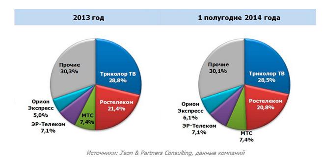 Крупнейшими игроками на рынке платного ТВ в России являются «Триколор ТВ» (доля рынка 29%), «Ростелеком» (21%), МТС (7%) , «ЭР-Телеком» (7%) и «Орион-Экспресс» (6%). Абонентская база оператора «Триколор ТВ» за первое полугодие 2014 года увеличилась на 5%, на рост подключений непосредственно влияет контентное наполнение пакетов телеканалами в формате высокой четкости, а также дополнительные сервисы и клиентские программы.