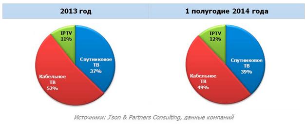 На кабельное телевидение сегодня приходится чуть менее половины всего рынка платного ТВ (49%), что на 3% ниже в сравнении с 2013 годом. Доля спутникового телевидения составила 39%. Доля IPTV выросла до 12%.