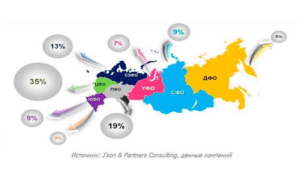 В первом полугодии 2014 года распределение абонентской базы по федеральным округам не претерпело существенных изменений. Более половины базы генерируется Приволжским и Центральным федеральными округами. По количеству абонентов платного телевидения лидирует Центральный федеральный округ – 35% от рынка России в целом.