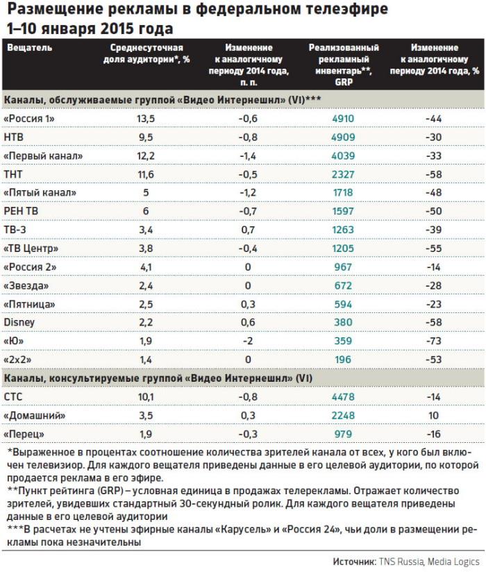 Новый год начался на ТВ с резкого сокращения рекламных объемов, свидетельствуют первые результаты телеизмерений TNS Russia. По просьбе РБК консалтинговая компания Media Logics, входящая в рекламную группу Vivaki Russia, проанализировала размещение рекламы в телеэфире 1–10 января 2015 года. Общая продолжительность рекламных блоков в эфире 17 основных федеральных вещателей в первую декаду упала по сравнению с аналогичным периодом 2014 года на 37% и составила чуть больше 32 часов в день. Падение зафиксировано абсолютно на всех каналах.
