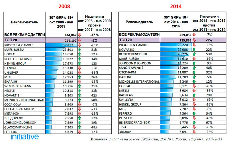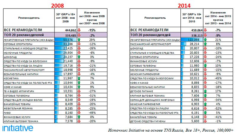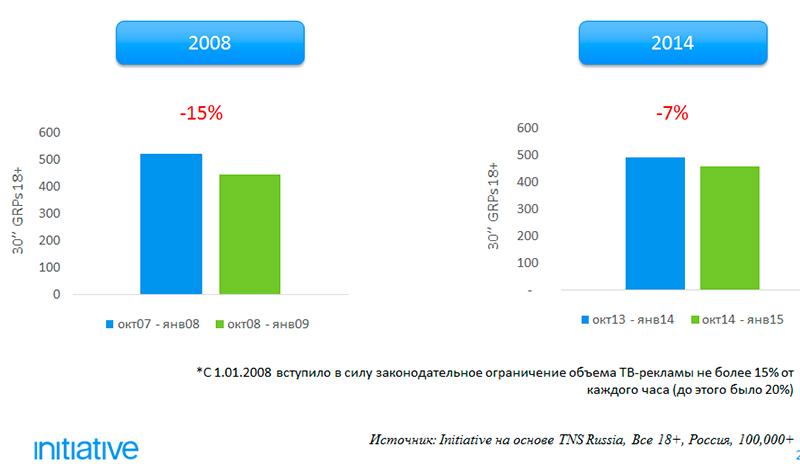 Агентство Initiative специально для AdIndex проанализировало размещение рекламы в телеэфире в октябре–январе 2008-2009 гг. и 2014-2015 гг.