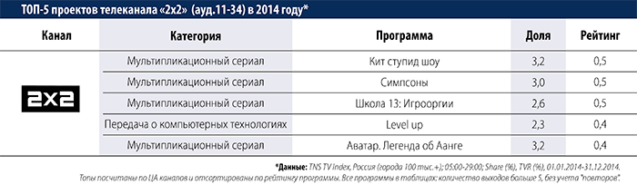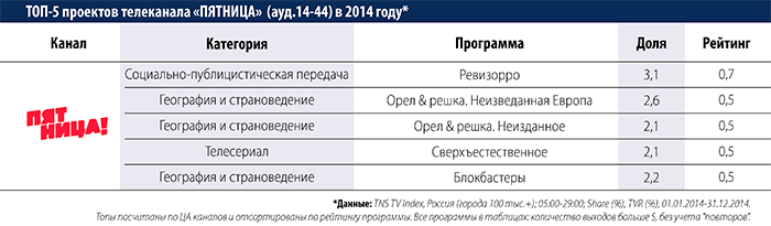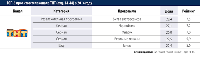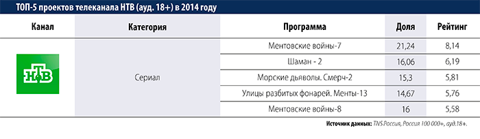 Холдинг Газпром-Медиа подвел итоги деятельности своих эфирных телеканалов (НТВ, ТНТ, ТВ-3, Пятница! и 2х2) в 2014 году и опубликовал на своем сайте самые рейтинговые проекты этих каналов