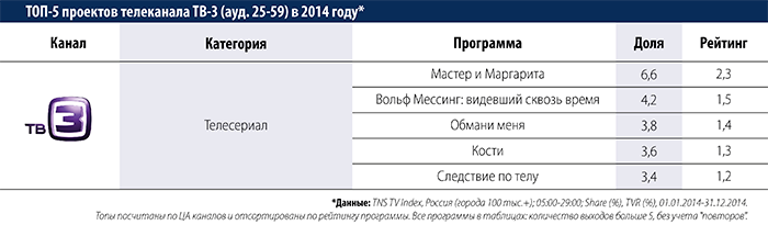 Самым рейтинговым проектом ТВ-3 в 2014 году стал сериал 'Мастер и Маргарита', а второе место занял многосерийный фильм 'Вольф Мессинг: видевший сквозь время'. Остальные места в пятерке лидеров заняли зарубежные сериалы: 'Обмани меня' (Lie to Me), 'Кости' (Bones) и 'Следствие по телу' (Body of Proof).
