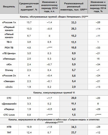 Детальная информация по реализованному каждым из телеканалов рекламному инвентарю не позволяет выявить какой-то общей закономерности. Теоретически наибольшее падение продаж телерекламы в натуральном выражении должны демонстрировать каналы, которые активнее всего теряют зрителей.