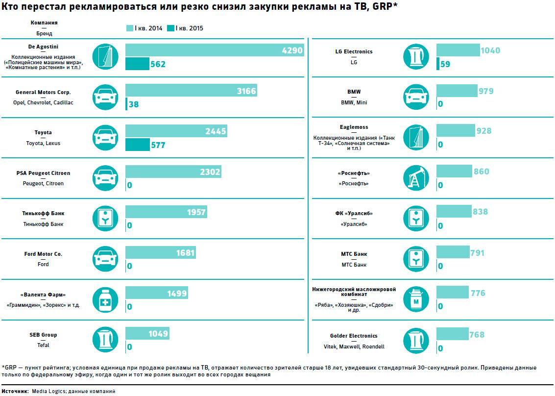 В первом квартале 2015 года 12 из 100 крупнейших покупателей телерекламы полностью отказались от эфира. Среди них — Peugeot Citroen, Тинькофф Банк и «Роснефть»