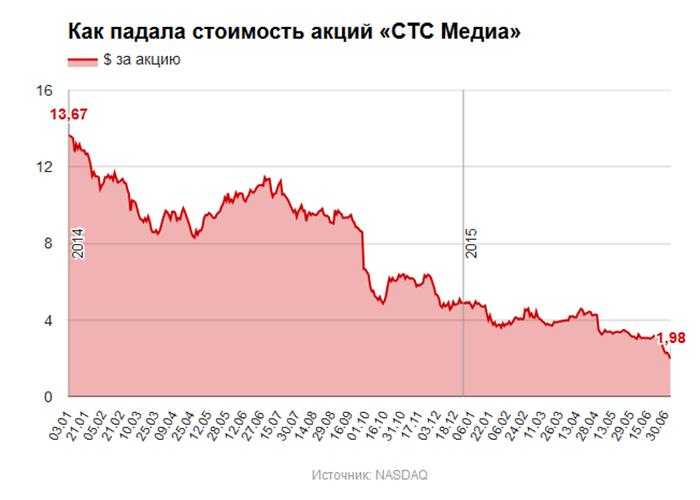 Акции «СТС Медиа» начали падать с момента принятия закона об ограничении иностранного капитала в СМИ. С начала 2015 года «СТС Медиа» подешевела на 60%. 29 июня стоимость одной акции компании опустилась до минимального уровня с момента ее IPO в 2006 году — $2,56 за бумагу.