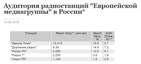 Европейская медиагруппа (ЕМГ; Европа Плюс, Дорожное радио, Радио 7, Ретро FM и др.) Владимира Гридина и Михаила Федяева, потратившая на запуск федеральной радиостанции Спорт FM 1 млрд руб., начала сокращать ее сеть вещания. Роскомнадзор разрешил холдингу запустить на частотах спортивной станции сразу в восьми городах, включая миллионники Новосибирск, Нижний Новгород и Самару, другие свои форматы — музыкальные Дорожное радио, Радио 7 и Ретро FM. В России спортивным радиостанциям пока не удавалось достичь коммерческого успеха, констатируют участники рынка