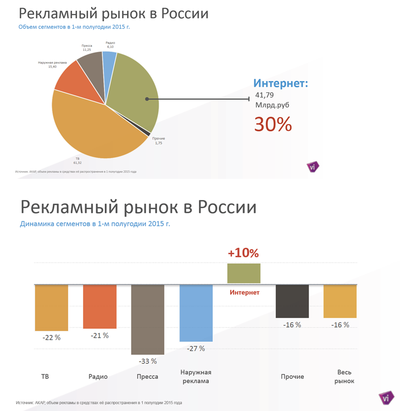 Илья Алексеев, генеральный директор IMHO Vi, представил данные по рынку за первую половину 2015 года. Интернет-сегмент занял 30% рынка по итогам первого полугодия, его объем составил 41,79 млрд рублей. Это единственный сегмент, показавший рост в 10% на фоне снижения рекламного рынка на 16%. Однако его рост неоднородный. Контекстная и видеореклама стали основными драйверами. Контекст увеличился на 15%, видео – на 8,25%. Баннерная реклама сократилась на 17%, интернет-display снизился на 11%.