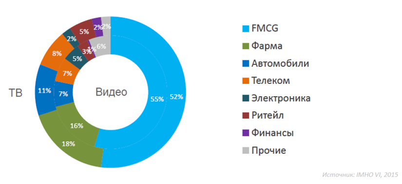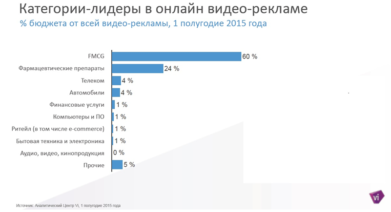 Традиционно в онлайн-видеорекламе лидирует FMCG-сегмент. В 2015 году он сохраняет позиции – доля бюджета категории составила 60% в первом полугодии. Далее следует фарма – 24%. Таким образом, на лидеров приходится практически 85% объема рынка видеорекламы.