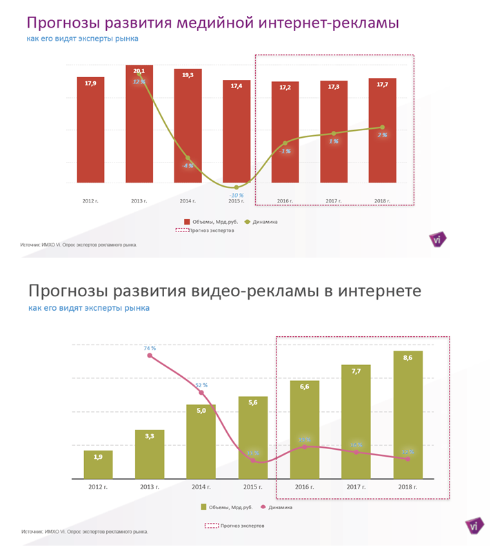 Составляя прогнозы развития рекламного рынка, эксперты отмечают, что в третьем-четвертом кварталах динамика рынка улучшится. В долгосрочной перспективе к 2018 году медийная интернет-реклама покажет положительную динамику. Темпы развития видеорекламы в интернете замедлятся, но будут показывать неплохие цифры.