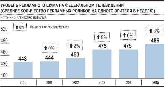 Показатель рекламного шума, учитывающий среднее количество рекламных роликов на телезрителя в неделю, на федеральном российском ТВ вырос в прошлом году на 3%, до 489 роликов, подсчитало медиаагентство Initiative на основе данных TNS Russia. В 2014 году этот показатель стагнировал, составив, как и в 2013-м, 475 роликов. Пиковых значений рекламный шум на российском ТВ достигал в 2005–2006 годах: 544 и 536 роликов в неделю соответственно. Показатель начал снижаться после принятия ограничений на количество рекламного времени — сначала до 12 минут в час с середины 2006 года, а потом и до действующего лимита в девять минут в час с 2008-го.