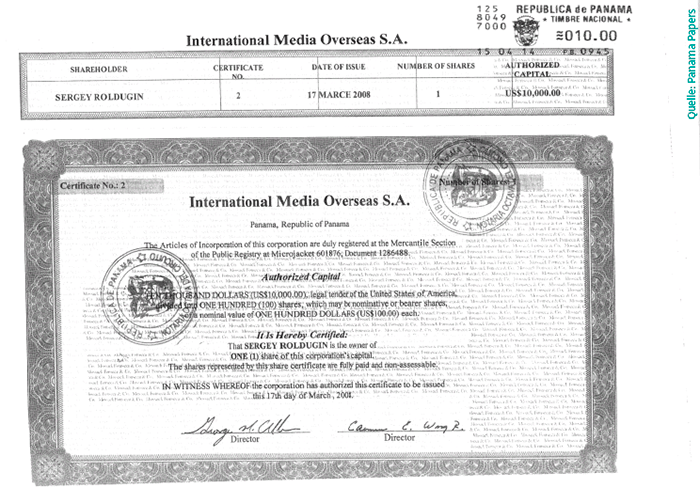 С 2008 по 2015 годы г-н Ролдугин был бенефициаром зарегистрированной в Панаме International Media Overseas. У нее есть дочерняя компания – кипрская Med Media Network Ltd. Как утверждает «Новая газета», в базе данных Mossack Fonseca есть решение единственного акционера Med Media Network, то есть панамской International Media Overseas, от 15 декабря 2010 года о приобретении за $20 млн 12,5% Vi. Позже, сообщают «Новая газета» и «Ведомости», доля Med Media Network в Vi увечилась до 20%. В 2014 году Med Media Network получила 268,4 млн руб. дивидендов, при этом, обращают внимание «Ведомости», у Med Media Network никаких активов кроме доли в Vi нет. Иными словами, это дивиденды от Vi.