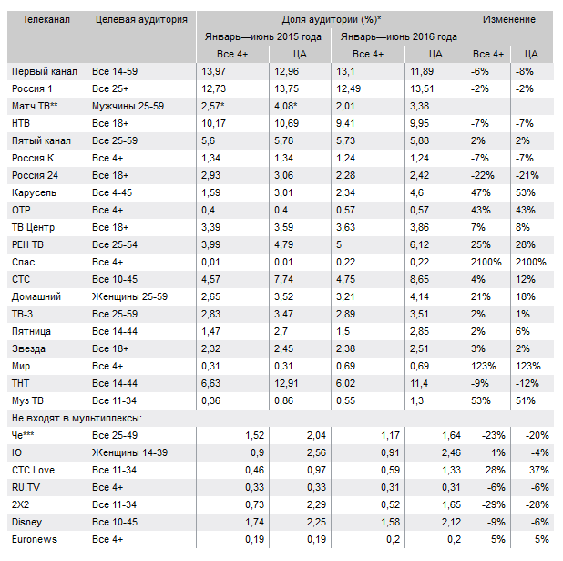 С августа 2015 года, когда вступили в силу поправки к законам 'О СМИ' и 'О связи', закрепляющие кнопки с 11-й по 20-ю в телевизионных сетях за каналами второго мультиплекса, аудитория большинства из них резко выросла, свидетельствуют данные TNS Russia. Вторая десятка кнопок закреплена за РЕН ТВ, 'Спасом', СТС, 'Домашним', ТВ-3, 'Пятницей', 'Звездой', 'Миром', ТНТ и 'Муз-ТВ'. Так, в первом полугодии 2016-го доля в целевой аудитории канала РЕН ТВ, оказавшегося на 11-й кнопке, выросла на 28% к аналогичному периоду прошлого года. Доля СТС и 'Домашнего' увеличилась на 12% и 18% соответственно. Незначительно увеличили долю ТВ-3 и 'Звезда'. 'Муз-ТВ' вырос на 51%, 'Мир' — на 123%, а православный 'Спас' — на 2100% (см. таблицу).