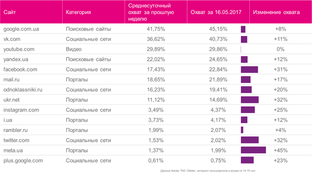 «Уже можно уверено прогнозировать рост охвата Facebook.com и Ukr.net приблизительно на +30%, не избежит прироста охвата Instagram и достаточно непопулярная соц.сеть в Украине — Google+», — отмечает Анна Шахдинарян, руководитель проекта интернет-исследований Kantar TNS CMeter, сообщает украинское издание.
