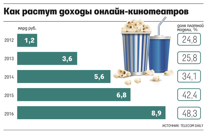 За аналогичный период прошлого года доходы от платной модели составляли 49% по расчетам Telecom Daily, а всего доходы онлайн-кинотеатров за первые полгода 2017 г. выросли на 70% и достигли 5,3 млрд руб., всего же в 2017 году по прогнозам аналитиков компании доходы сервисов достигнут 11 млрд руб. Как считают в аналитической компании, в том числе доходы от платной модели подписки увеличиваются из-за роста популярности Smart TV.