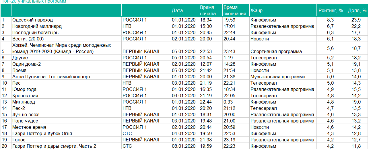 Топ-20 программ по уникальному выходу с 1 по 8 января 2020 г., Mediascope. Данные включают домашнее и дачное телесмотрение среди аудитории старше четырех лет