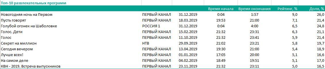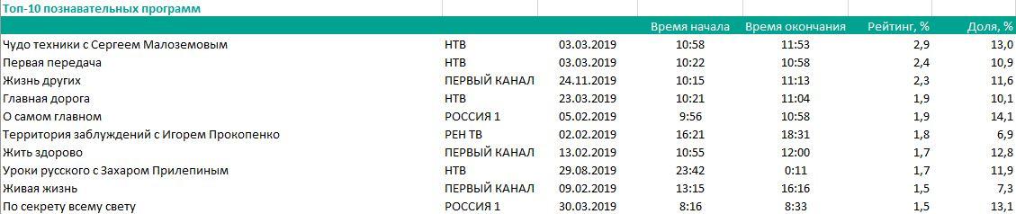 По пять мест у конкурентов в топе музыкальных передач, причем первые три строчки занимает «Россия 1»: «Новогодний парад звезд», финал Евровидения-2019 и юбилейный концерт Александры Пахмутовой. В категории познавательных программ заметнее всего представлен НТВ, у него сразу четыре проекта в топ-10: «Чудо техники с Сергеем Малоземовым», «Первая передача», «Главная дорога», «Уроки русского с Захаром Прилепиным». Кроме того, НТВ достойно представлен в социально-политических программах: первое место занимают «Новые русские сенсации», в топе также «Следствие вели... с Леонидом Каневским», «Центральное телевидение» и «НашПотребНадзор». «Человек и закон» (выпуск от 18 января) на втором месте, «Москва. Кремль. Путин» (от 3 февраля) — на четвертом, «60 минут» (от 10 января) — на шестом месте, «Воскресный вечер с Владимиром Соловьевым» (от 20 января) — на седьмом.