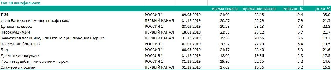 Места в кинотопе разделились поровну между советской классикой и фильмами последних двух-трех лет. К первой категории относятся «Иван Васильевич меняет профессию», «Кавказская пленница, или Новые приключения Шурика», «Служебный роман» («Первый канал»), «Джентльмены удачи», «Ирония судьбы, или С легким паром» («Россия 1»). Конкуренцию им составили уже упомянутый «Т-34», «Движение вверх», «Последний богатырь», «Лед» («Россия 1») и «Несокрушимый» («Первый канал»).