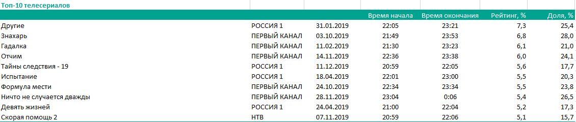 В топ-10 сериалов с самыми высокими рейтингами (россияне старше 4 лет, проживающие в городах с населением свыше 100 тысяч человек) вошли еще три проекта «России 1» («Тайны следствия — 19», «Испытание», «Девять жизней»), пять проектов «Первого канала» («Знахарь», «Гадалка», «Отчим», «Формула мести», «Ничто не случается дважды») и один — НТВ («Скорая помощь — 2»).