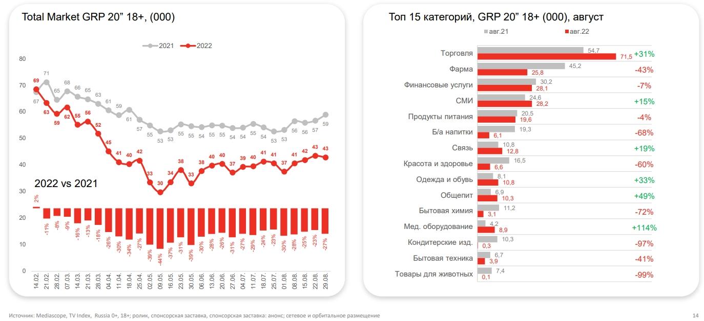 С июня по август темпы сокращения проданного инвентаря на ТВ держатся науровне -26%, согласно подсчетам OMD OM, основанным на данных Mediascope.Драйвером роста телерекламы остается ретейл.