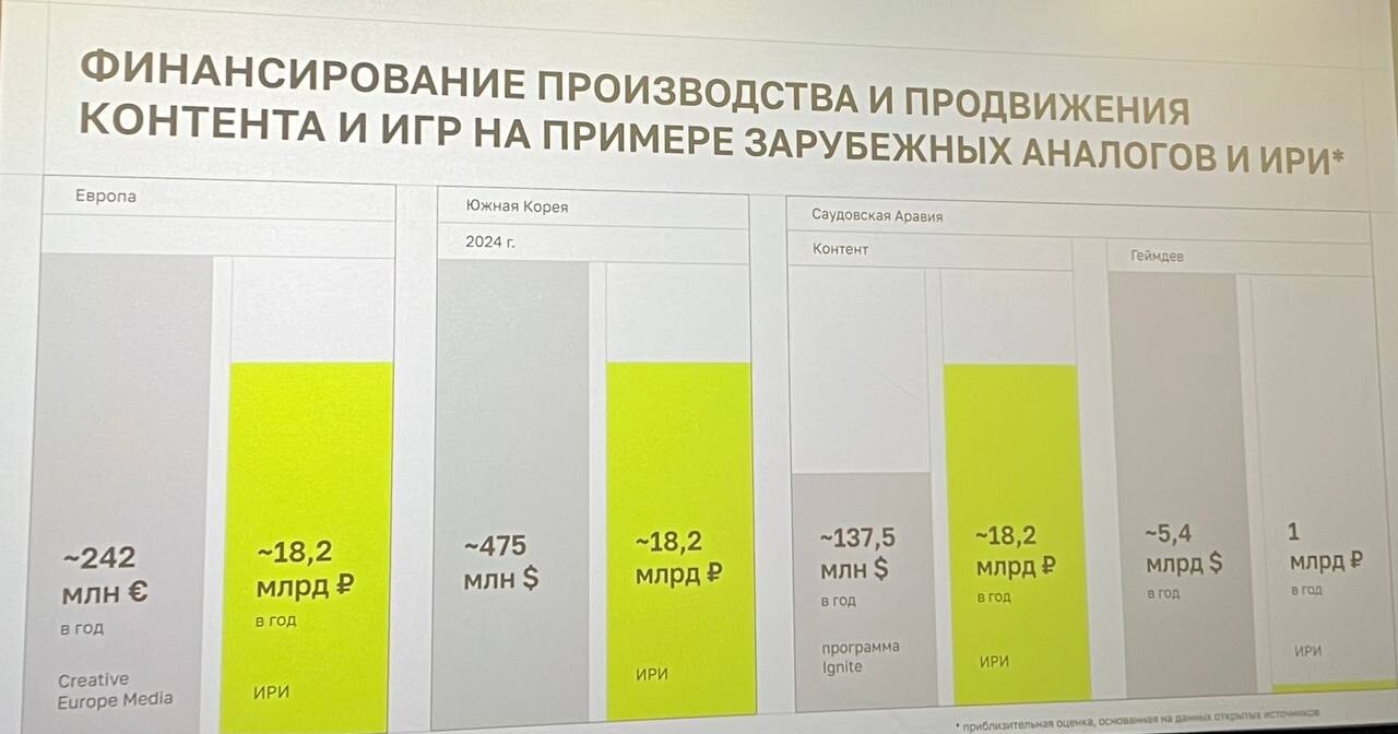 Институт развития интернета (ИРИ) выделил 18,2 млрд руб. на производство ипродвижение контента и игр, сообщил генеральный директор Алексей Гореславскийна презентации итогов года. В 2023 г. бюджетсоставлял 20,7 млрд руб.