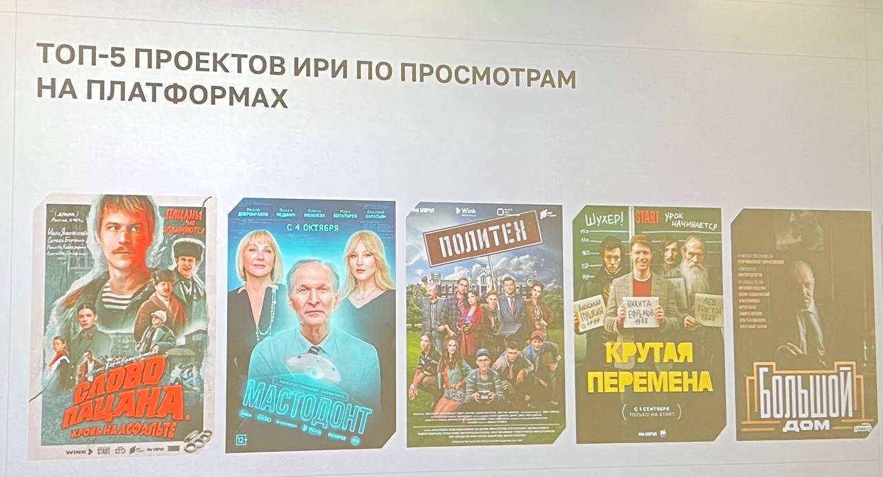 Доля контента ИРИ среди оригинальных проектов онлайн-кинотеатров достигла37%, это на 11% больше, чем в 2022 г. В топ-5 проектов ИРИ по просмотрам наплатформах вошли «Слово Пацана», «Мастодонт», «Политех», «Крутая перемена»,«Большой дом».