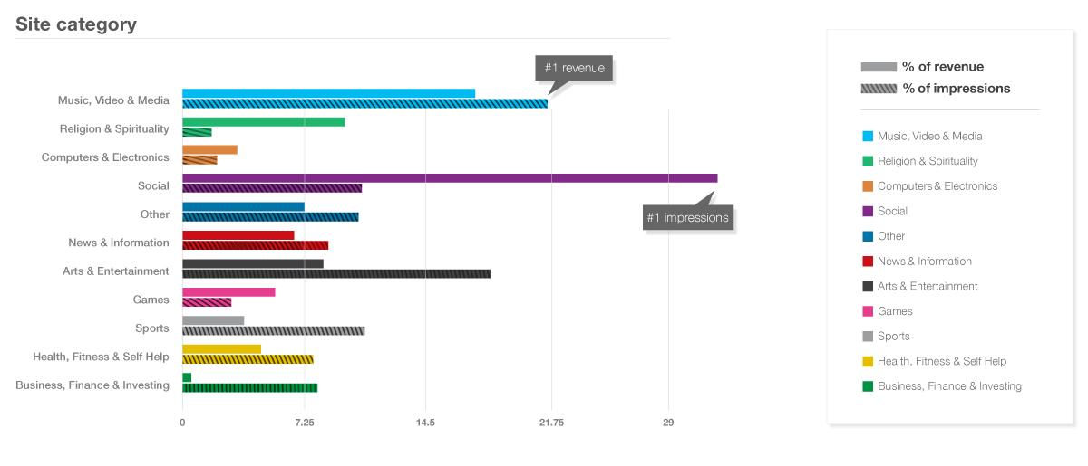 34,2% всего объема рекламного трафика пришлось на социальные сети и приложения, тогда как на категорию «Музыка, видео и медиа» – всего 17,7%. Вместе с тем, именно эта категория генерирует больше всего дохода от мобильной рекламы: на нее приходится 20,6% всего полученного дохода.