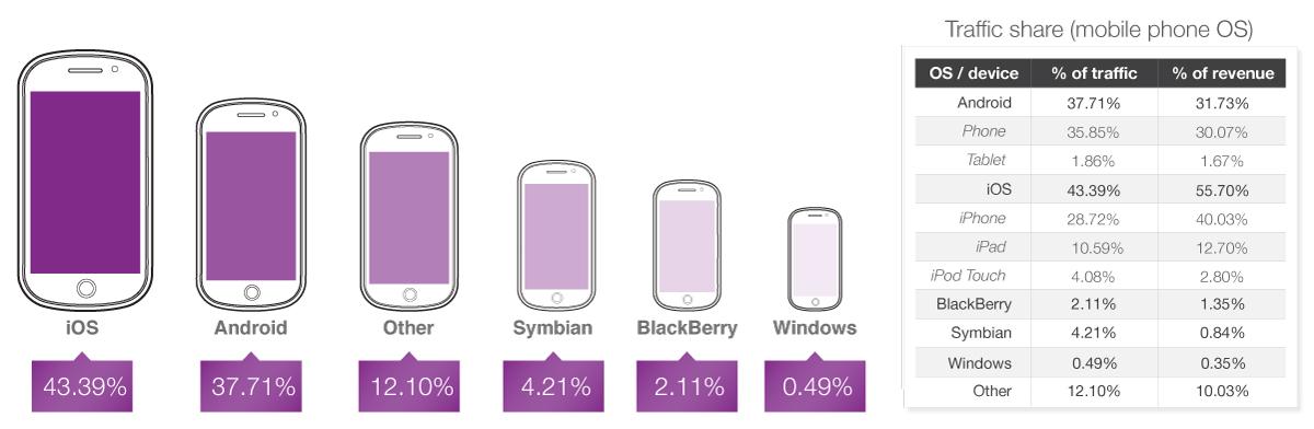 Доля iOS по-прежнему лидирует в общем объеме выручки от показа мобильной рекламы и составляет 56%, что на 6% выше аналогичного показателя третьего квартала. Однако, количество показов мобильной рекламы на Android-смартфонах выше, чем на iPhone: 36% всех показов мобильной рекламы приходится на Android-смартфоны и 28,7% – на iPhone.