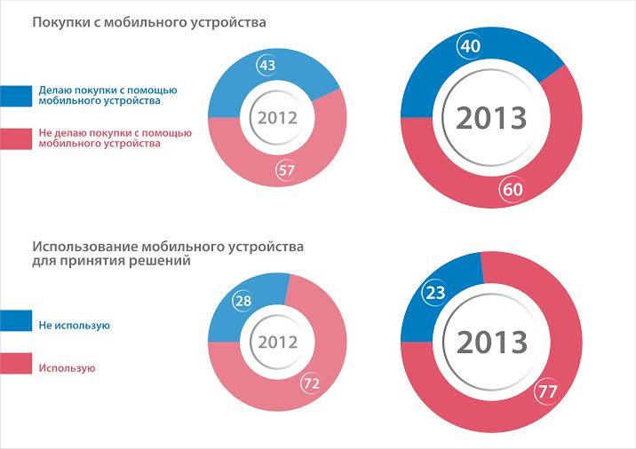 При этом, только 40% пользователей совершают покупки при помощи мобильных устройств. Таким образом, больше половины мобильной аудитории используют канал мобильной рекламы для удовлетворения своей потребности в информации, совершая покупки либо локально, либо с помощью большого интернета. По сравнению с 2012 годом, в 2013 году показатели изменились незначительно.