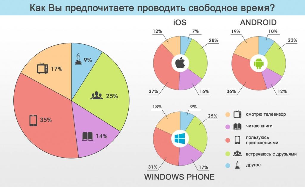 Примечательно, что чаще других читать книги предпочитают пользователи устройств с операционной системы Windows Phone (16,8), в то время, как пользователи iOS чаще других играют в игры и пользуются приложениями (37,2%). Телевизор же смотрят чаще других пользователи Android (19%).