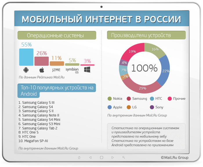 Mail.Ru Group провела масштабное исследование российского рынка мобильного интернета. Аналитики компании составили портрет пользователя мобильного интернета, выявили наиболее популярные мобильные платформы и модели смартфонов, а также изучили географию проникновения мобильного интернета в России
