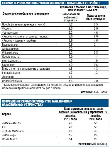 В сети «ВКонтакте» не называют даже число своих мобильных пользователей. В Москве ежемесячная аудитория сети среди тех, кто заходит на страницу сети через мобильные устройства или использует ее мобильное приложение, достигает, по данным TNS Russia на май 2014 года, 3,5 млн человек 12—64 лет (столичная аудитория тех, кто заходит в сеть с персональных компьютеров и ноутбуков, в том же мае равнялась почти 5 млн человек). Ранее руководство «ВКонтакте» обещало запустить мобильную рекламу в сети этим летом, сейчас исполнительный директор сети Дмитрий Сергеев говорит об осени.