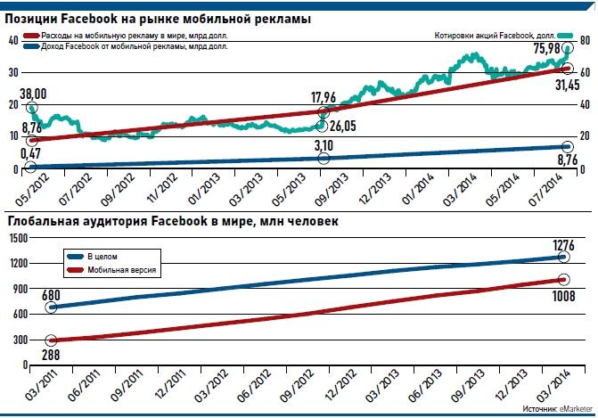 Еще в начале 2012 года Facebook обходилась без поступлений от мобильной рекламы, но опережающий рост мобильной аудитории вынуждал сеть думать, как зарабатывать на этом деньги. Эта проблема воспринималась инвесторами как один из основных рисков IPO социальной сети в мае 2012 года. И уже в четвертом квартале 2013 года доля выручки Facebook от мобильной рекламы в общей рекламной выручке впервые превысила 50%.