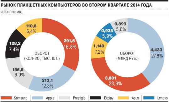 За последние три месяца выручка от продажи планшетов в России снизилась на 17,5% в сравнении с первым кварталом 2014 года и на 2,8% к аналогичному периоду прошлого года, составив 15,9 млрд руб., подсчитала компания МТС. В частности, продажи различных моделей iPad сократились почти на 24% в количественном и денежном выражении в сравнении со вторым кварталом 2013 года. Планшеты с операционной системой Windows за тот же период принесли ритейлерам на 22,8% меньше денег, хотя количественно их продажи выросли на 5,87%. Спрос на планшеты с ОС Android, наоборот, увеличился на 36,8% в штуках и на 7,7% в рублях.