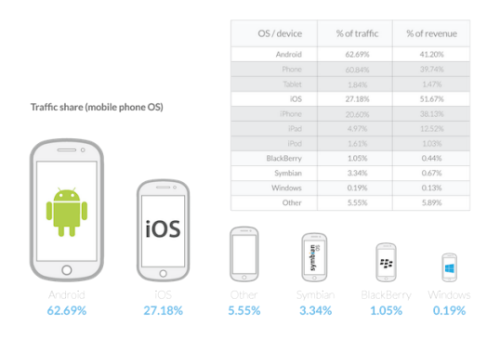На Android приходится большая часть (63%) трафика мобильной рекламы в 4 квартале 2014 года, тогда как Apple по-прежнему сохраняет лидерство в доходах, согласно отчету State of Mobile Advertising, представленному сегодня компанией Opera Mediaworks.
