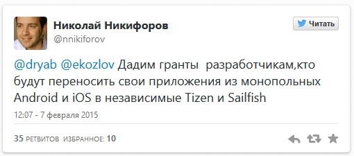 Данные заявления произошли во время обсуждения публикации Никифоровым фотографии смартфона Samsung Z1, который работает на операционной системе Tizen. Фотографию он подписал следующей фразой: «Навстречу демонополизации мировой ИТ-экосистемы — держу в руках телефон с новой открытой операционной системой».