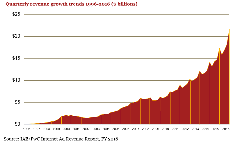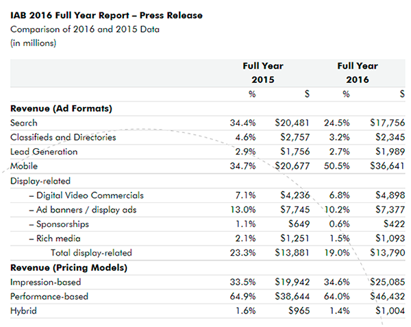 На мобильную рекламу пришлось более половины (51%) из $72,5 млрд, потраченных рекламодателями в прошлом году, согласно последнему отчету IAB Internet Advertising Revenue, подготовленным PwC США. Общие доходы увеличились на 22% по сравнению с 59,6 млрд $ в 2015 году, сегмент мобильной рекламы продемонстрировал рост на 77% с $20,7 млрд в прошлом периоде до $36,6 млрд в 2016 году.
