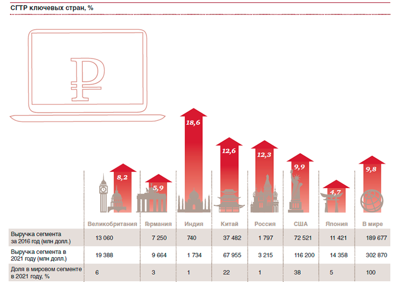 Российский рынок интернет-рекламы продолжает занимать лидирующую позицию среди стран Центральной и Восточной Европы. Рекламодатели продолжают активно вкладывать средства в онлайн- рекламу, благодаря чему выручка от нее продолжит расти. Ожидается, что в 2017 г. он увеличится до $2,1 млрд.