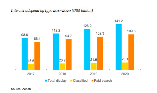 Zenith оценивает затраты маркетологов на цифровую рекламу в 2020 году в $141,2 млрд, что составит 44,6% от общих затрат на рекламу. Аналогичные показатели в 2017 году — $98,6 млрд при доле в 37,6%. Отмечается, что общий рост digital-рекламы замедляется, однако данная сфера индустрии остается самым быстрорастущей. По оценкам Zenith, в 2017 году цифровая реклама выросла на 14% при темпах роста в 10% каждый следующий год до 2020 года.