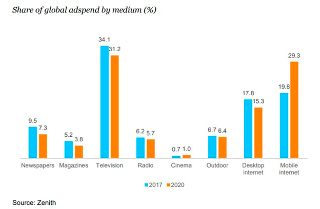 Несмотря на то, что телевидение ранее всегда занимало лидирующие позиции в отрасли, в 2017 году digital-реклама занимает большую долю рынка. По состоянию на 2017 год доля телевидения упала до 34,1% и, согласно прогнозам, продолжит снижаться – в 2020 году эксперты ожидают, что доля телерекламы составит 31,2%.