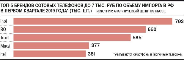 Всего, по данным GS Group, в первом квартале в Россию импортировано 11,6 млн мобильных телефонов, из которых 42% (6,32 млн штук) пришлось на смартфоны. В топ-5 в этом сегменте (помимо Inoi) также вошли российские бренды BQ, Texet, Maxvi и китайский Itel.
