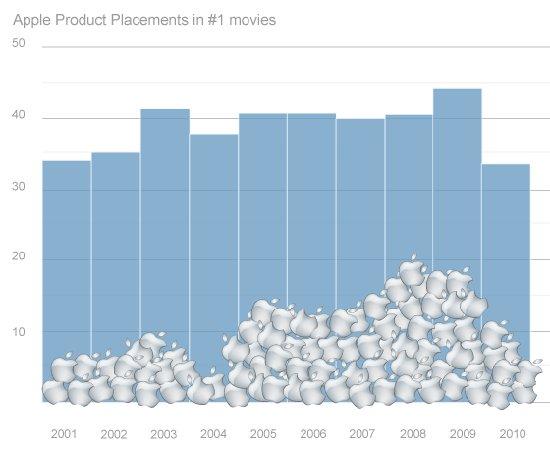 Однако в 2009 году показатель присутствия скрытой рекламы Apple в самых популярных фильмах был существенно выше — 44% (19 из 44), а в 2008 — достигал и вовсе почти 50% (20 из 41). Brandcameo указывает, что это случилось из-за того, что многие компании взяли на вооружение подход Apple: фильм, где раньше доминировала Apple, сегодня заполнены логотипами HP, Dell и Sony VAIO.
