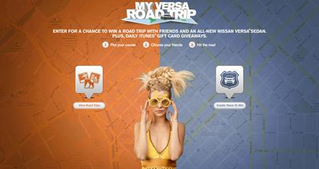 На сайте www.MyVersaRoadTrip.com с функцией Facebook Connect можно составить свой собственный маршрут, добавляя населенные пункты, через которые он будет проходить, выбрать одну из пяти мелодий-гимнов путешественника и добавить трех друзей, готовых сопровождать вас в этом приключении. Чтобы стать одной из команд, которые отправятся в реальное путешествие по США, необходимо написать небольшое пояснительное послание, длиной не более 104 знаков, которое должно убедить бренд выбрать именно вас (пространство автомобиля Versa составляет именно 104 кубических футов, и Nissan уверен, что 104 знака — это вполне достаточно для раскрытия мотивации).