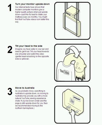Видео-сервис Google, YouTube, продолжил волну шуток перевертыванием содержимого своей страницы вверх тормашками. По словам представителей сервиса, такой дизайн страницы был признан наиболее удобным. Пользователи же получили простые советы, как сделать его удобным для себя. Как сообщалось на сервере, возможные сложности легко решались переворачиванием монитора, наклонением головы (так, будто в ней вода и ее необходимо вылить) или переездом в Австралии, в страну антиподов.