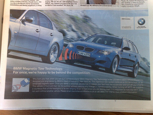 Традицию первоапрельских розыгрышей не забыла и BMW, разместившая в прессе рекламу нового устройства, предназначенного для экономии топлива. Согласно описанию системы, при приближении к впереди идущему автомобилю запускается магнит, буквально цепляющийся за машину впереди. После этого можно убрать ногу с педали газа и заглушить мотор.